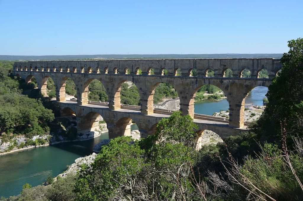 The Roman engineering circa 40-60 AD An aqueduct bridge crossing the Gordan River at Nimes, France.
